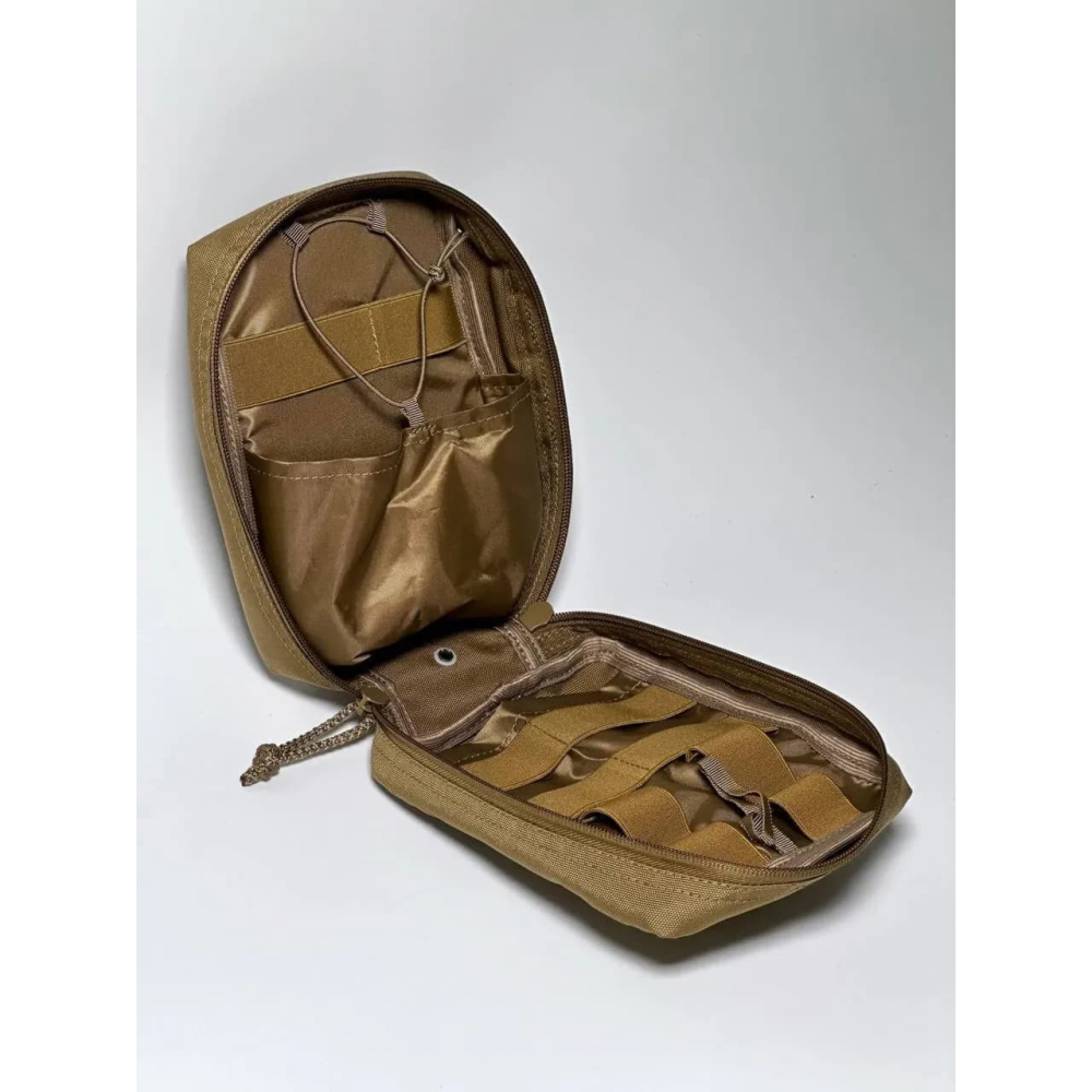 Зверху вшита стропа для ручного транспортування підсумку, а всередині передбачено дві великі різнорівневі кишені та комірки з плоскої та круглої гумки для фіксації всіх необхідних мед. приладдя.