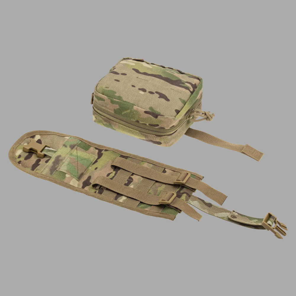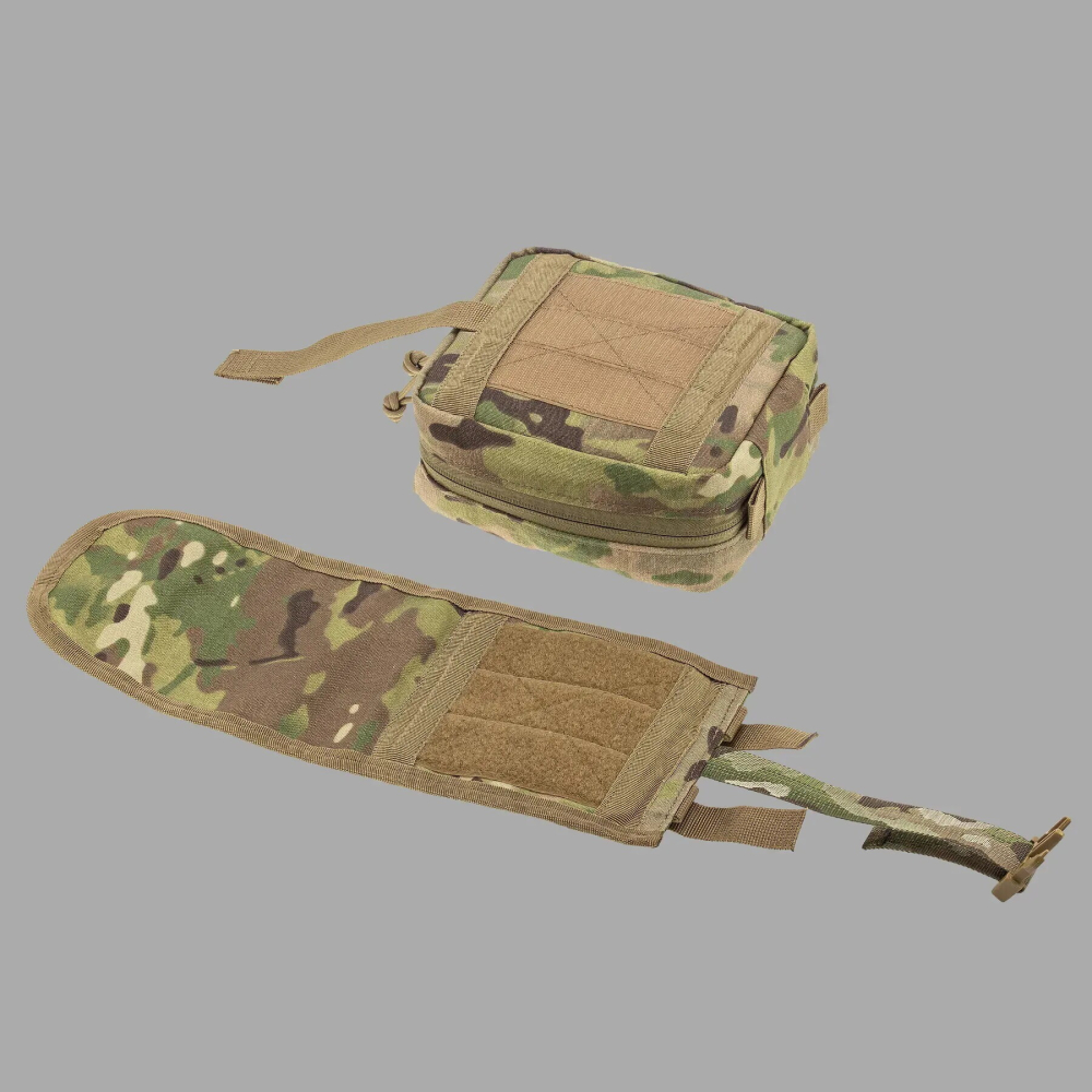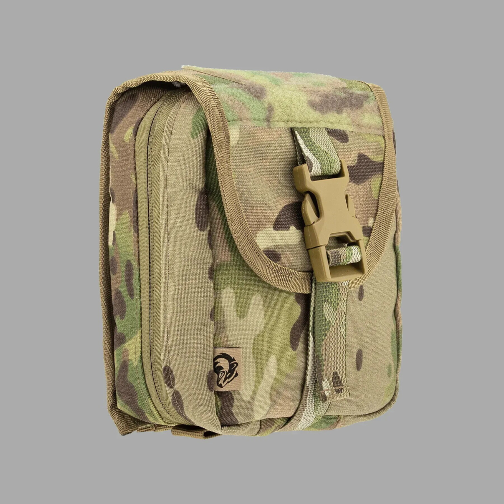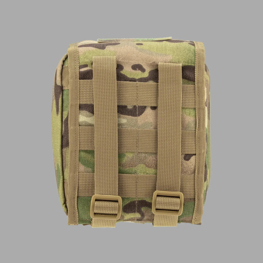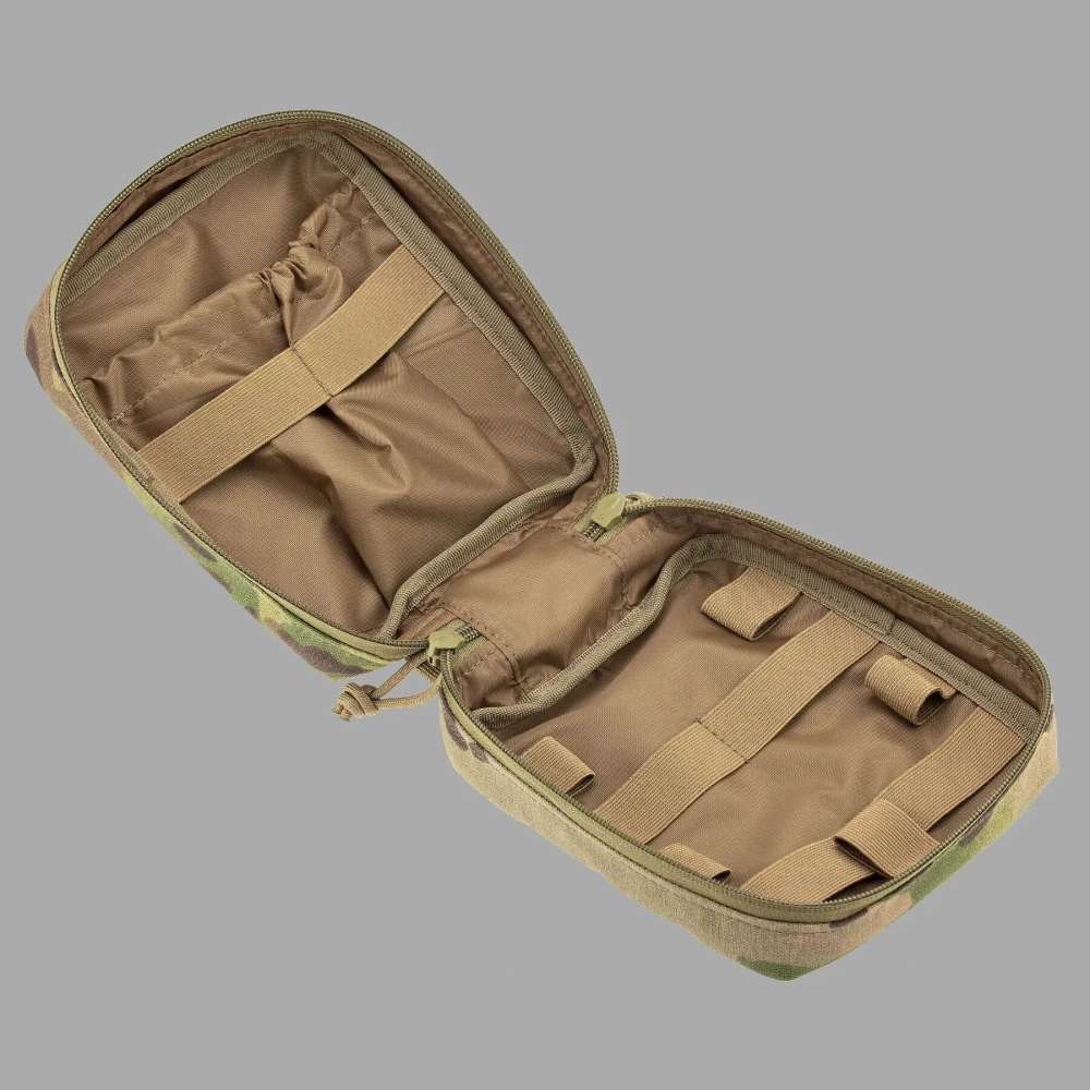 Підсумок під аптечку швидкого скидання для першої допомоги виготовлений з міцного та зносостійкого матеріалу. Оснащений багатьма внутрішніми еластичними ременями та об’ємною допоміжною кишенею, що забезпечує достатньо місця для розміщення медикаментів, інструментів, мед. матеріалу для надання первинної швидкої медичної допомоги у складних умовах. Має застібку по всьому контуру у вигляді блискавки, що дає можливість розкрити підсумок повністю і розкласти як книжку. Дана модель має основу з накидним зовнішнім клапаном на фастексі, який при застібанні міцно тримає його. Кріпиться підсумок до основи Velcro-липучкою, що дає змогу швидко зняти його при терміновій необхідності. Кріплення на тактичне спорядження підсумка під аптечку швидкого скидання відбувається через систему MOLLE. З лицьової сторони нашиті додатково ще дві Velcro-панелі для розрізнювальних патчів, медичних позначок, планок з групою крові тощо.