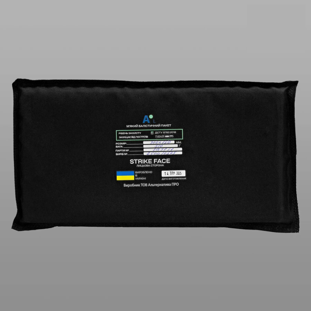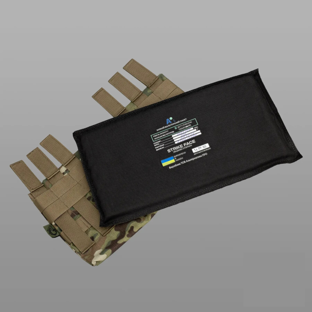 Балістичний пакет або м'який бронезахист – надійний засіб для захисту від уламків та куль, що забезпечує високий рівень безпеки завдяки комбінації синтетичного кевлару та високомолекулярного поліетилену (НВМПЕ). Захист відповідає 1 класу ДСТУ 8782:2018 та ефективно протистоїть снарядам калібру 9 х 18 мм (Makarov) і 9 х 19 мм (Luger). Пакет має розміри 300 х 150 мм та важить лише 300 грам, що робить його зручним у використанні.