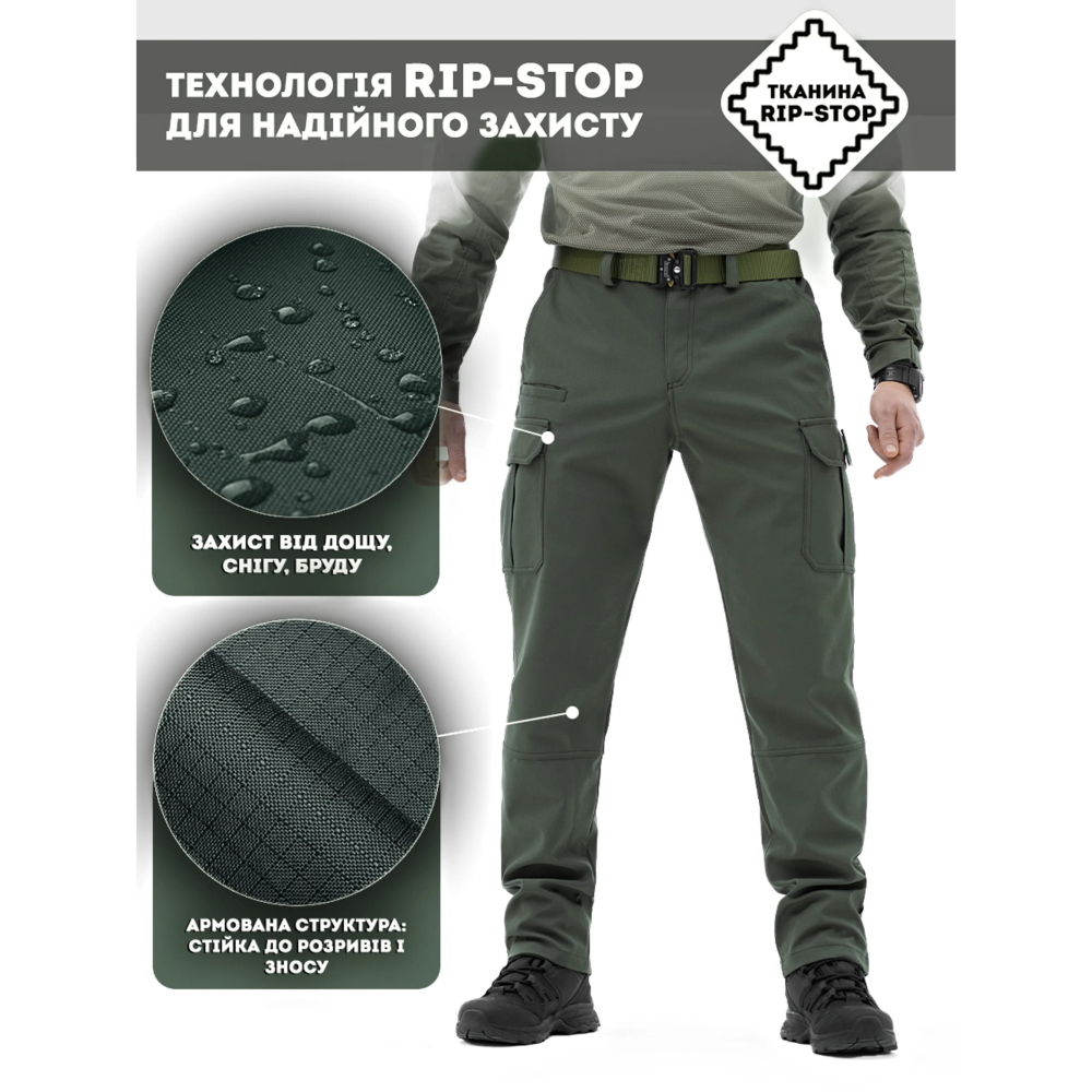 - Брюки карго виготовлені з двошарової тактичної тканини. Лицева частина тканини це міцний еластичний ріп-стоп з водовідштовхуючим просоченням, виворіт - інтерлок, тканина яка добре тягнеться, зберігає тепло та є приємною до тіла. Завдяки високій якості, легкості та інноваціності тканини, дані брюки чудово підійдуть для будь-яких активних дій;