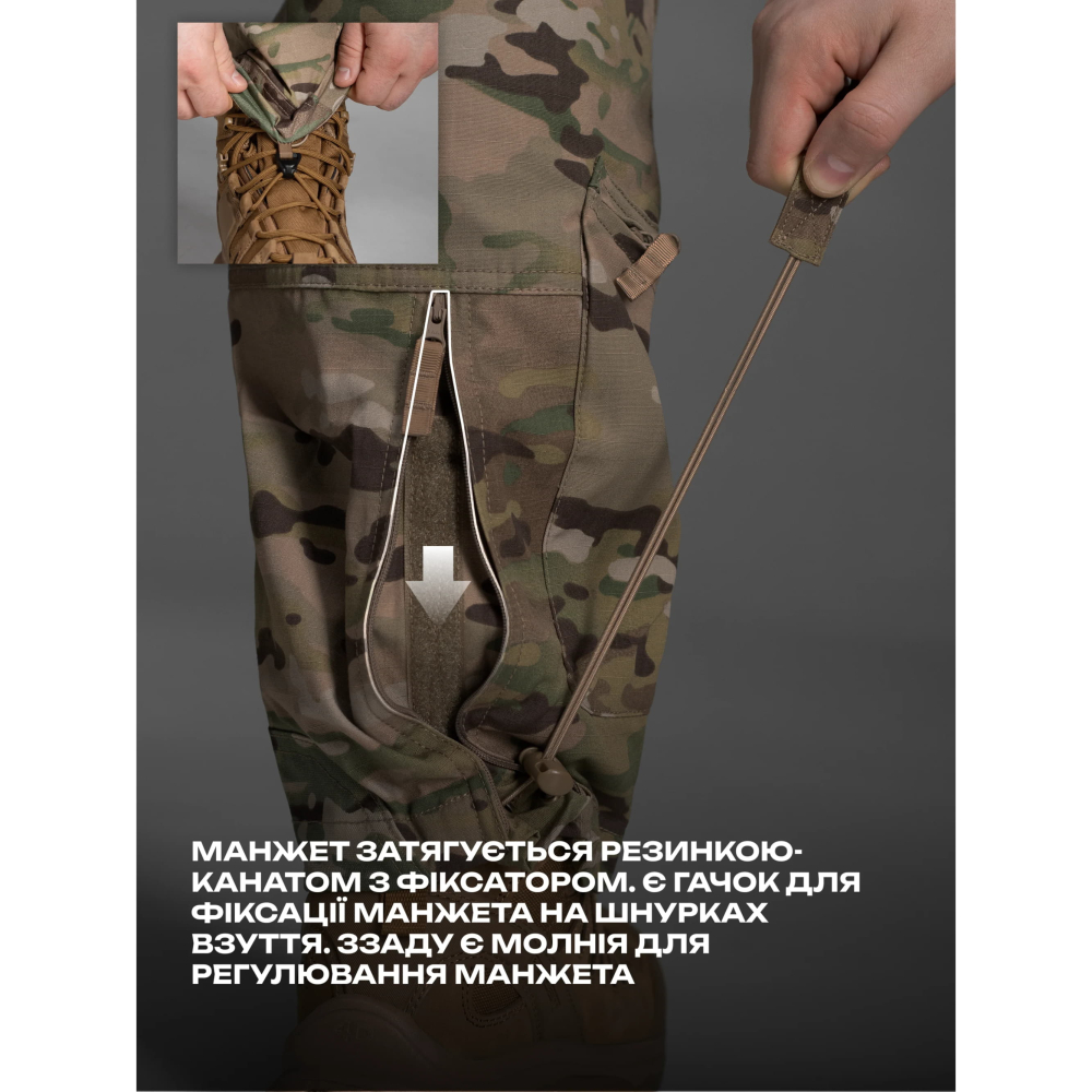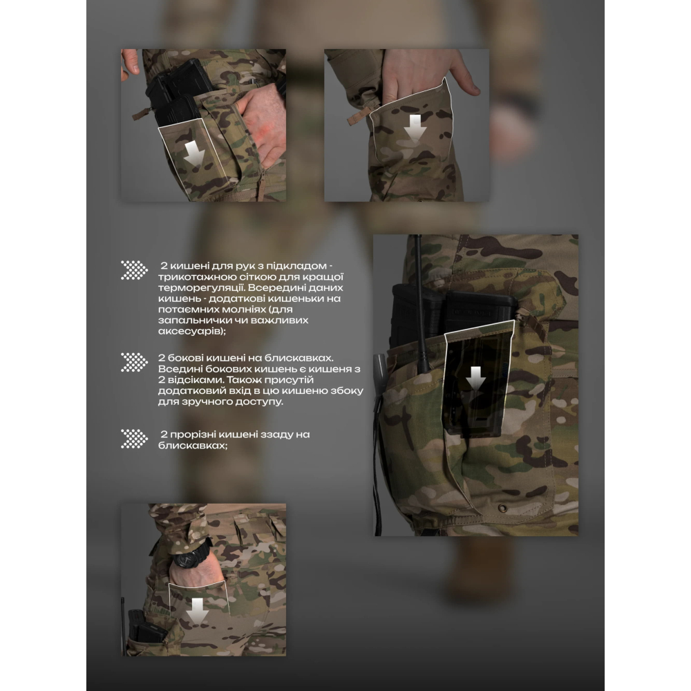 - Окрім Ripstop, у моделі штанів також використано плащову тканину 4-way strech у зоні сідниць, ластовиці, та колін для максимальної свободи рухів. А також використано вставки тканини Cordura у місцях підвищеного навантаження та зноження;