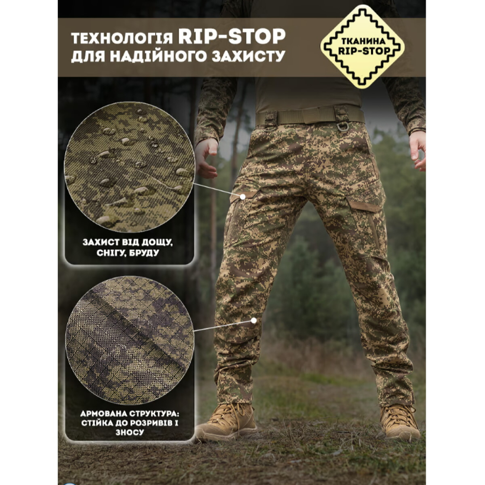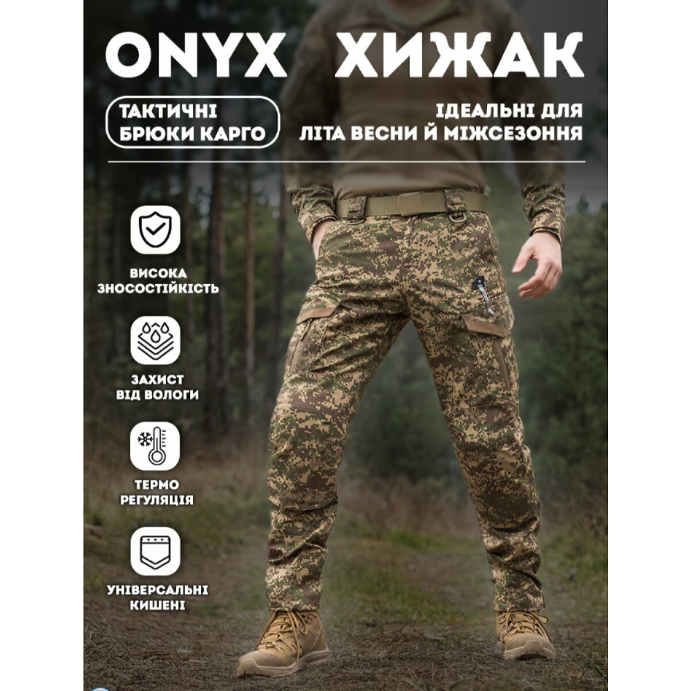 - Зручні та функціональні тактичні карго штани Onyx виготовлені з міцної тканини ріп стоп. У своєму складі, окрім бавовни, тканина має поліестер, який значно підвищує її зносостійкість та довговічність. Армовані нитки у плетінні створюють надійний "каркас", що запобігає пошкодженню під час механічних впливів. Тканина приємна до тіла, не парить, не вигорає, не змінює своєї форми під час частого використання/прання;