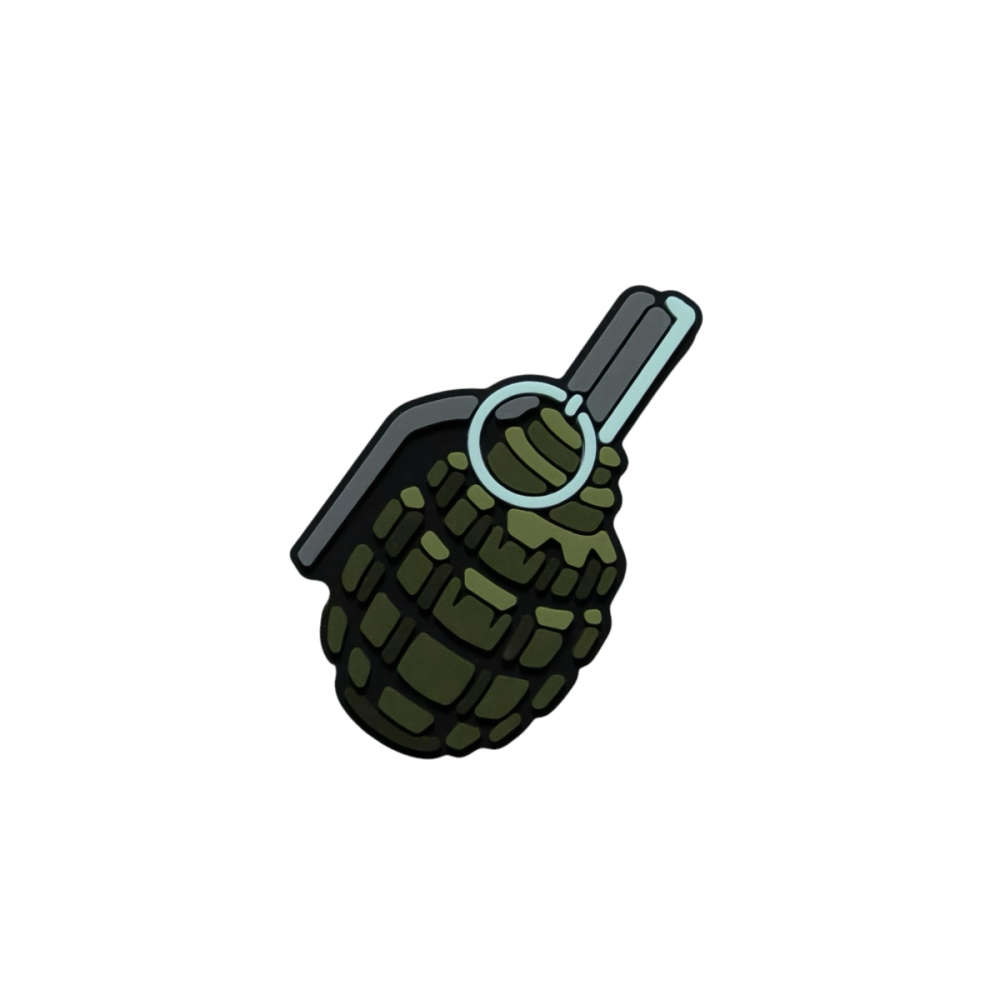 Цей набір джибітів від українського бренду Brand Element присвячений різноманітній військовій тематиці. У комплекті представлені об'ємні фігурки: класична осколкова граната типу f1 (19*35 мм), сучасна ручна граната М61 (27*35 мм), імітація протитанкової міни (35*28 мм), пістолет стилізований глок (35*24 мм) а також граната ВОГ-2. Виконані в реалістичних кольорах, ці джибіці стануть оригінальним доповненням до взуття або аксесуарів для тих, хто цікавиться військовою справою, страйкболом або цінує незвичайні деталі. Кожен елемент набору відрізняється деталізацією та якісним виконанням, характерним для продукції Brand Element.t.