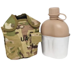Фляга місткістю 1 літр йде в наборі з додатковим комплектуючим — казанком і чохлом у відтінку фляги. Такий стильний аксесуар потрібний у польових умовах для транспортування особистого запасу води.