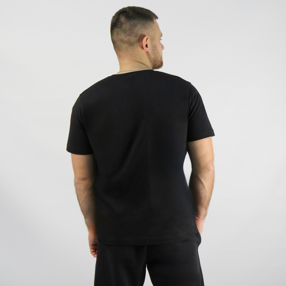 Футболка представлена у класичному чорному кольорі, має вільний крій, що додає комфорту при носінні. Відсутність зайвих деталей робить її універсальною та стильною.