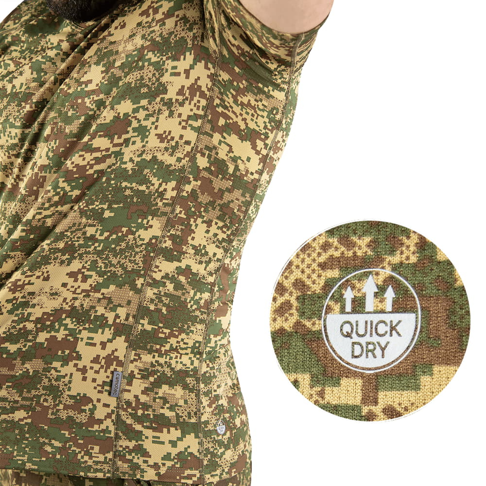 Ключовим елементом є нитка COOLPASS® з чотириканальною структурою, яка швидко вбирає вологу з поверхні тіла, рівномірно розподіляє її та сприяє швидкому висиханню. У тканину також вплетено антистатичну нитку, що знімає статичну напругу і запобігає електризації.