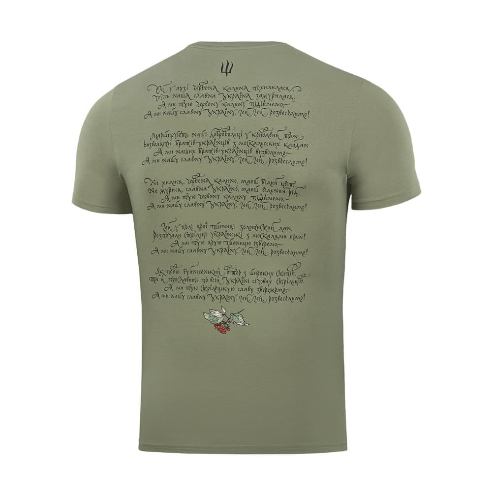 Форма тризубу на футболці відтворена переплетенням цвіту калини - головного природного символу України. Споконвіку, калина вважалась уособленням зв’язку між поколіннями та гордості за своїх предків. На спині футболки розміщено текст пісні “Ой у лузі червона калина”, яка за роки війни, стала символом єдності українського народу.