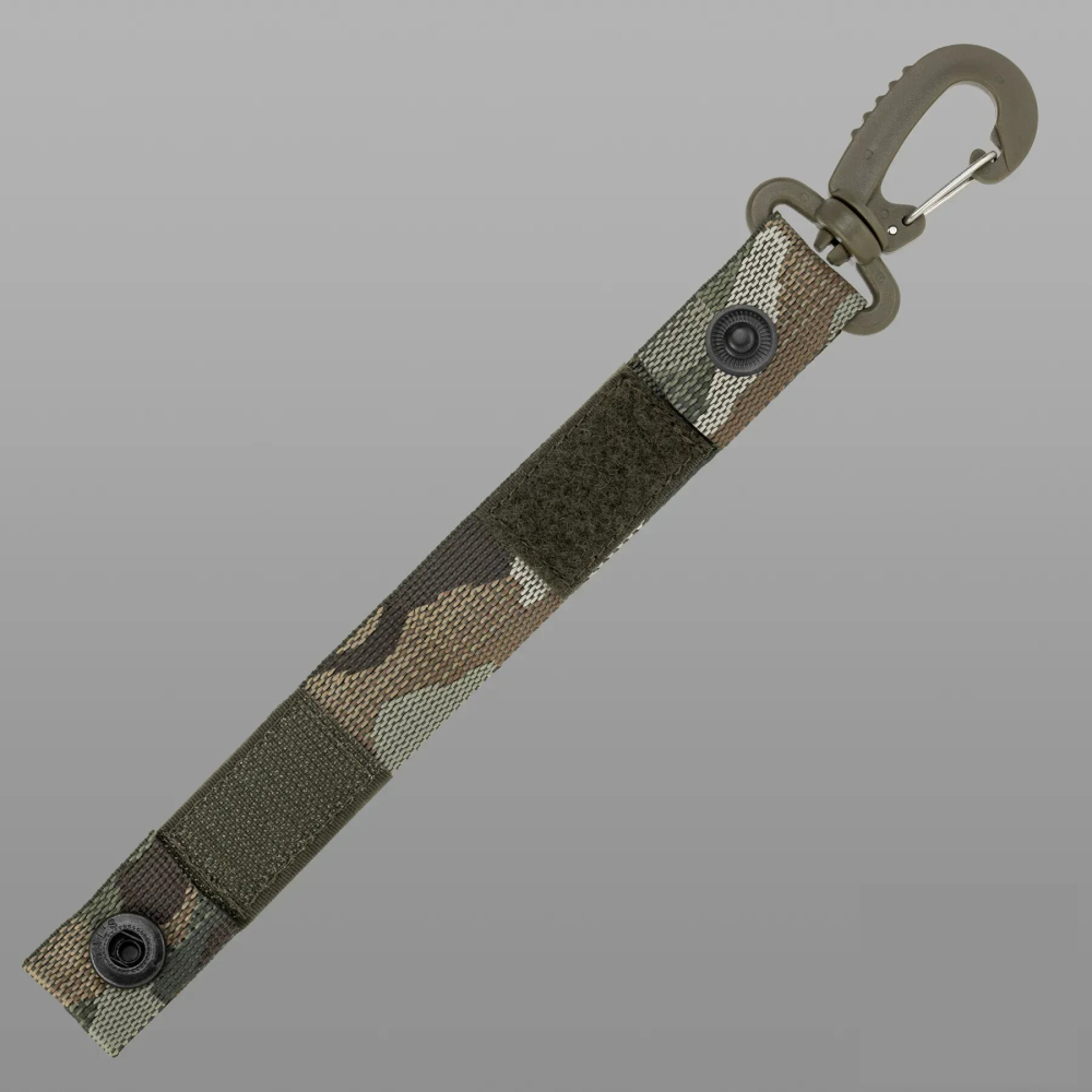 Карабін на стрічці – карабін тактичний з поясною петлею, оснащеною липучкою всередині та кнопкою для кріплення важливих негабаритних предметів, таких як перчатки, складний ніж, ключі тощо, що повинні бути завжди під рукою. Даний аксесуар кріпиться на рюкзак, пояс чи тактичне спорядження, що має систему MOLLE. Незамінна річ для військовослужбовців! Поясна петля має ширину 2.5 см, що відповідає стандартам системи MOLLE, а також може кріпитися на пояс шириною до 6см. Карабін не габаритний, а липучка, кнопка добре та щільно закриваються.