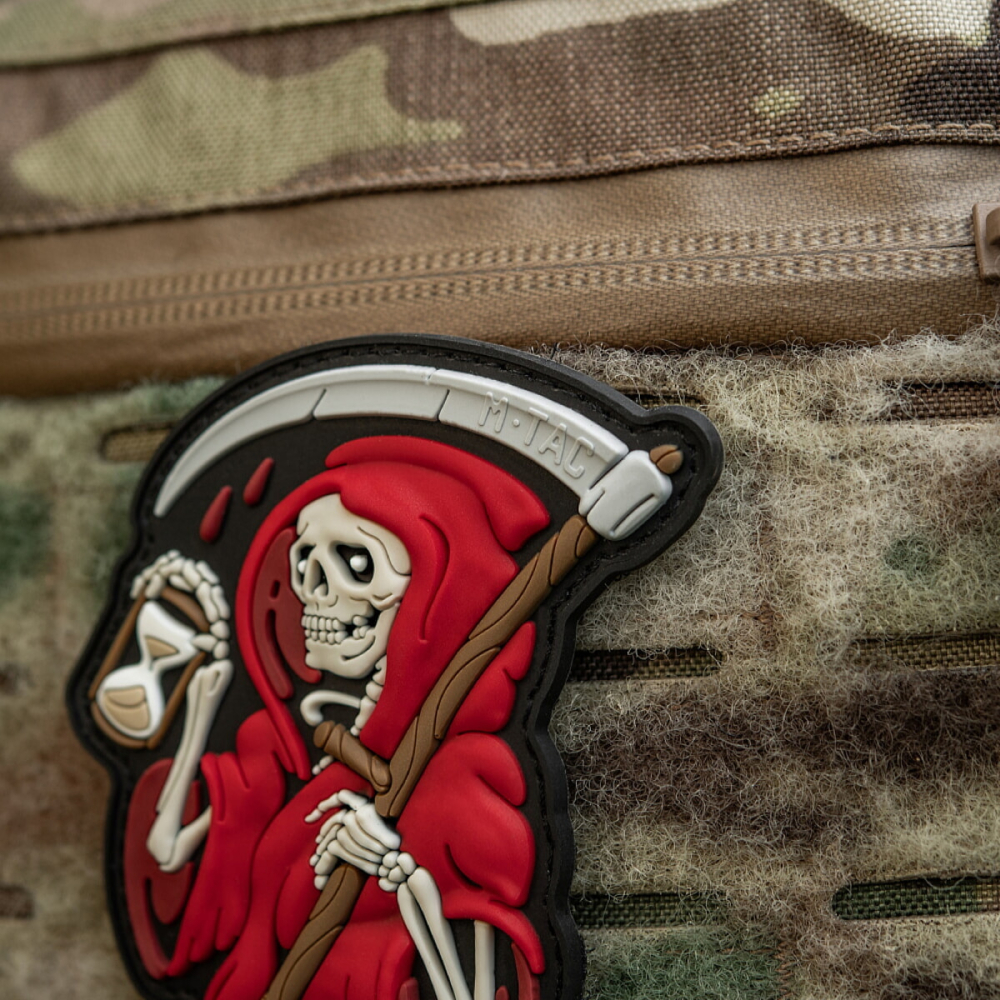 На нашивці зображено фрагмент оригінального принта – смерть, з пісочним годинником у руці. ЇЇ образ є нагадуванням про брак часу на прийняття рішень. Адже у боротьбі усе залежить лише від навичок, майстерності та вдачі, а кожен наступний хід може визначити: ти чи вона.
