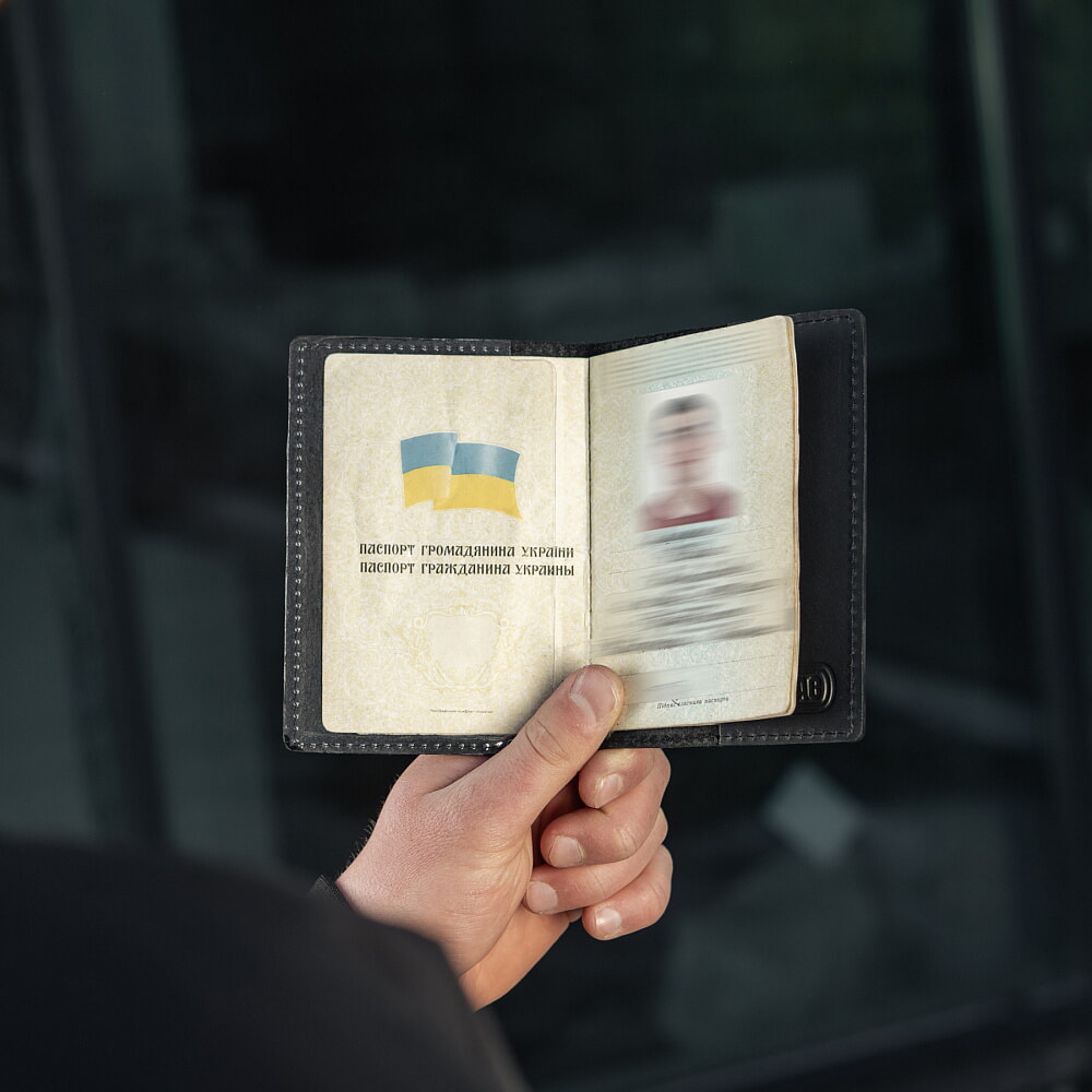 На фронтальній частині обкладинки розташований напис “UKRAINE”, зображений тризуб та відтворені орнаменти вишивки, що виступають символами незламності та єдності українського народу. На зворотній стороні обкладинки розміщений вертикальний напис «Passport». Всередині передбачені відсіки для зручного розміщення Вашого документа та стильний логотип бренду.
