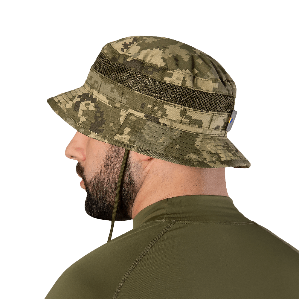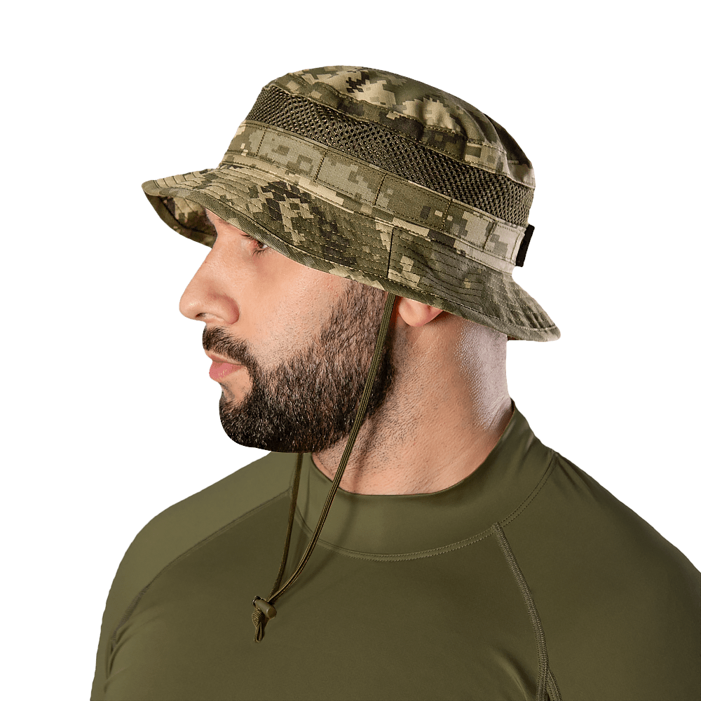 Панама зі стропою MOLLE для додаткового спорядження чи аксесуарів, і фіксацією за допомогою міцного шнурка з пластиковим фіксатором.
