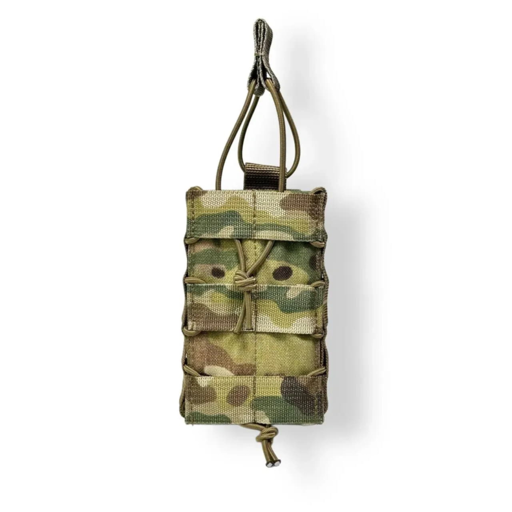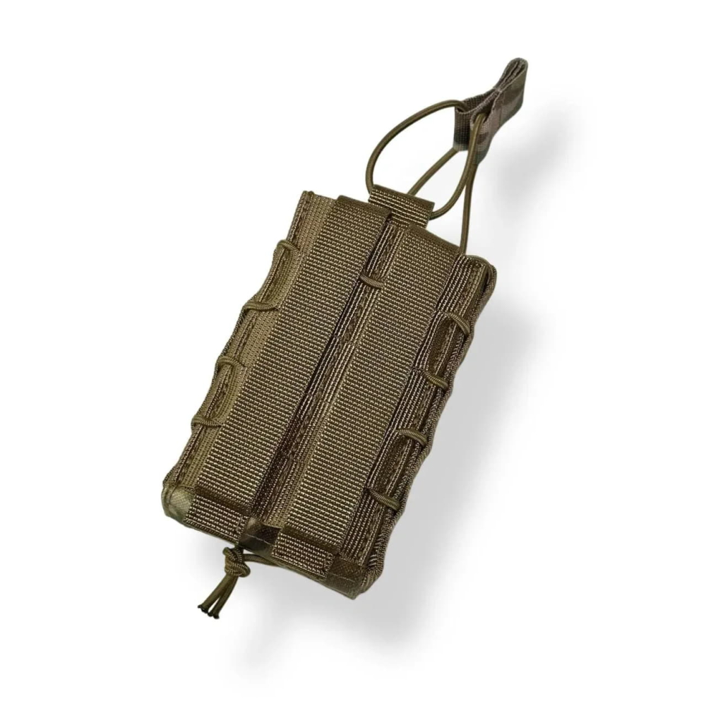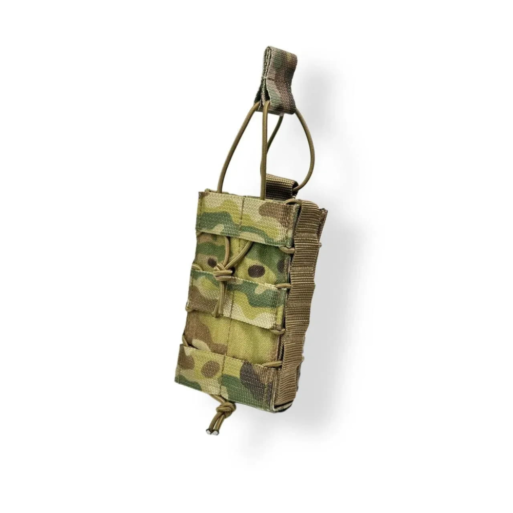 Зроблений з якісних матеріалів: Cordura 1000D, всередині вставлений пластик для жорсткості каркасу, резинка вставлена у середину бічних частин, щоб уникнути тертя об інший підсумок.