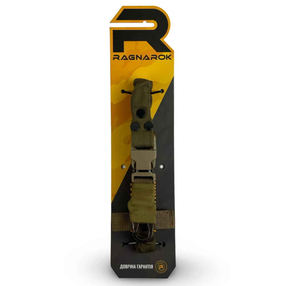 Ремінь Ragnarok виготовлений із поліамідної чулкової стропи та авіаційної плетеної резини. Це повністю регульований одноточковий ремінь для зброї, який кріпиться через Т-подібний хлястик до будь-якого MOLLE-сумісного жилета, нагрудника або броні.
