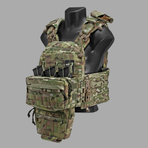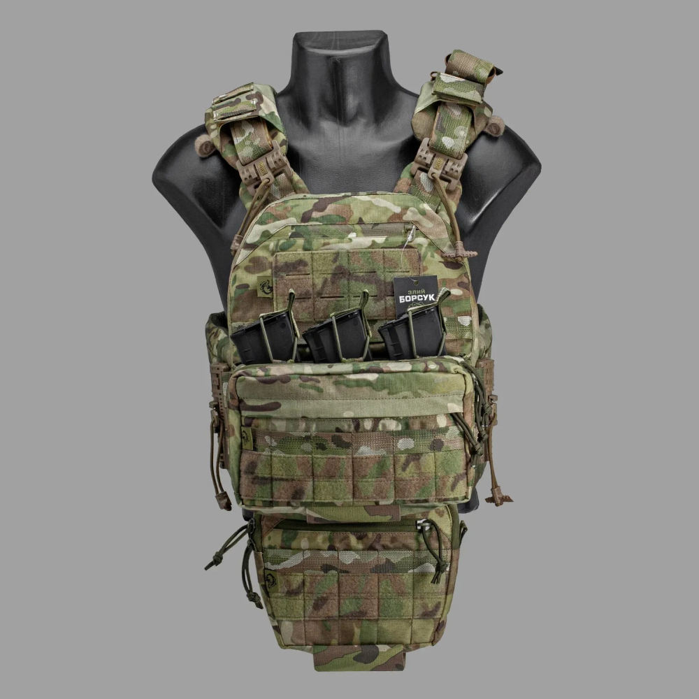 Зручний і функціональний комплект спорядження з надміцної зносостійкої кордури в кольорі «мультикам», що складається з нової плитоноски Модель №6 "STALKER" (сумісність з плитами 25х30 см, а також 15х20 та 15х30 см на камербандах, має 4 точки скиду, систему регулювання розміру на спині та плечах і систему MOLLE для кріплення додаткового спорядження), Утилітарний підсумок під 3 магазини, підсумку під турникет та сумки-напашника з кишенями під балістичні пакети.