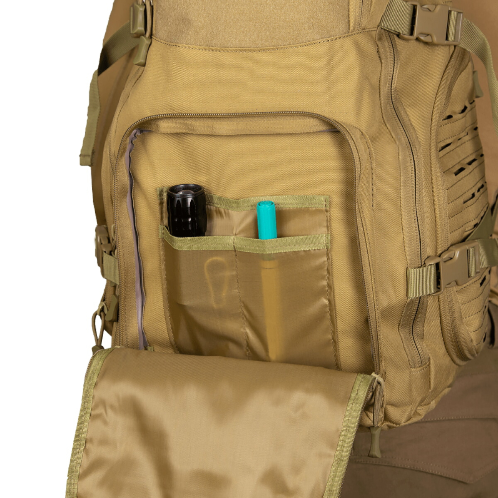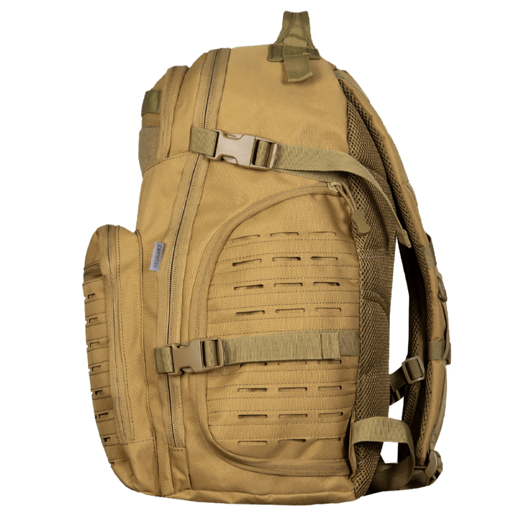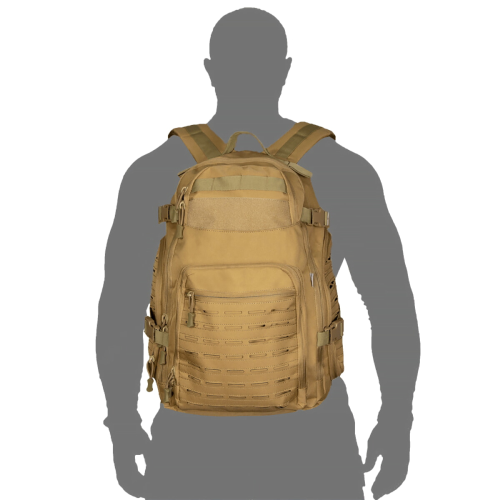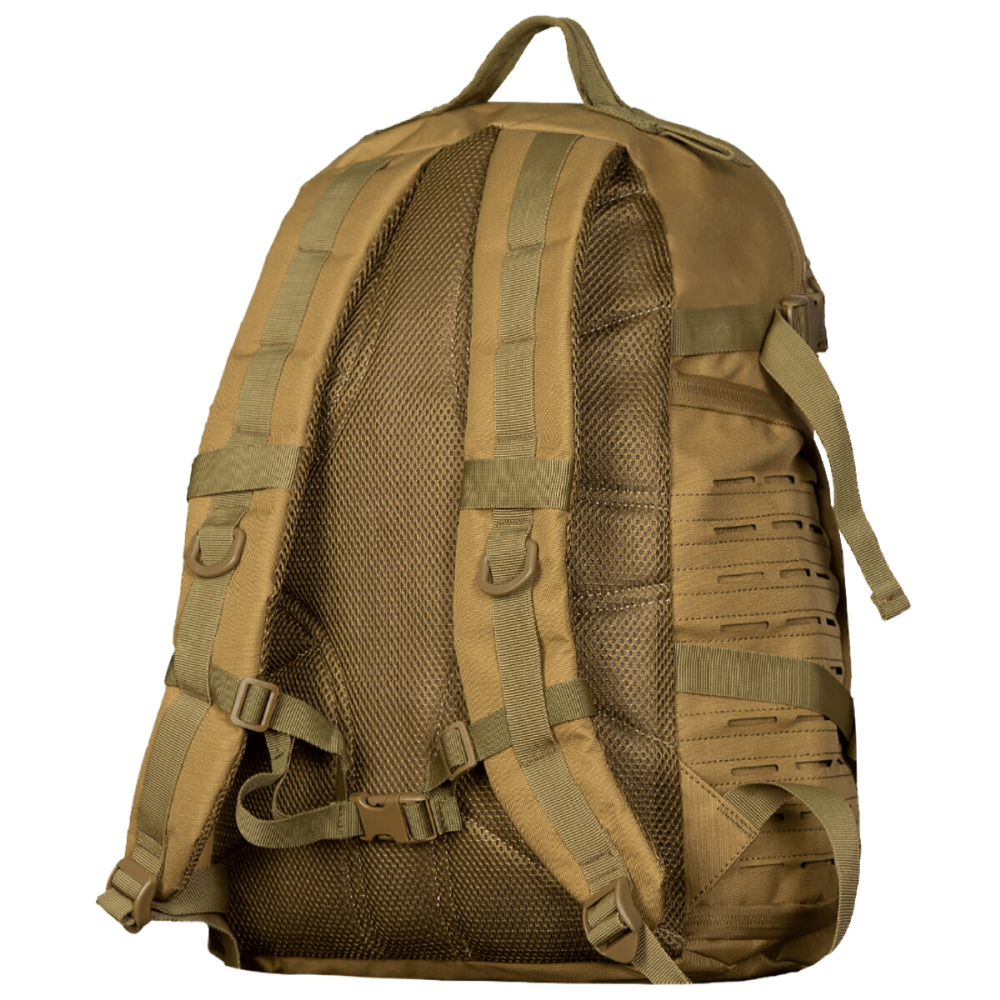 Тактичний рюкзак об'ємом 30 л. Рюкзак має ряд конструктивних особливостей, таких як стропи MOLLE, зроблених за технологією LC (laser cut), пулери на бігунках, D-кільця, а також додаткові лямки для фіксації об'єму (компресійні лямки).