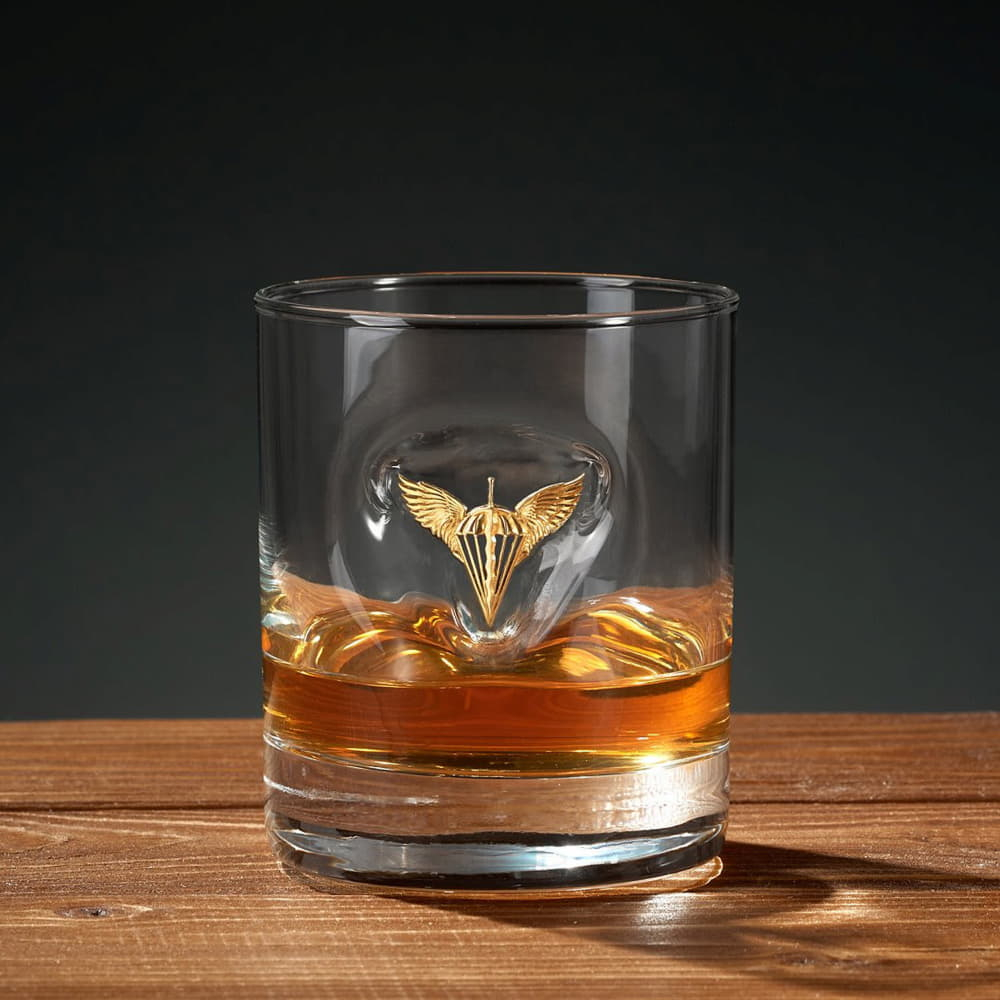 Оригінальний стакан створений спеціально для військовослужбовців Десантно-штурмових військ. На передній стороні стакана розміщена вишукана емблема ДШВ – парашут із розкритим куполом та осями, в центрі якого – меч із хвилястим лезом вістрям донизу та держаком золотого кольору. Доповнюють емблему два крила, як уособлення польоту над безоднею.