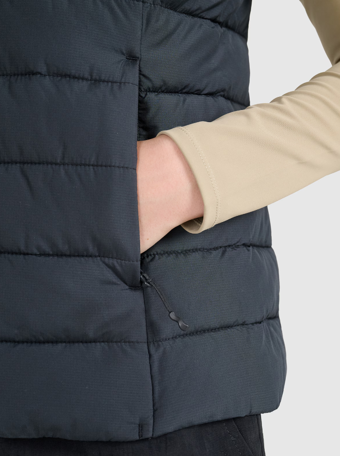 Коротка жіноча безрукавка з наповнювачем із синтетичного пуху, який є більш міцним та легшим у догляді, ніж натуральний пух. Навіть при контакті з вологою він довше зберігає свої ізоляційні властивості та набагато швидше сохне .