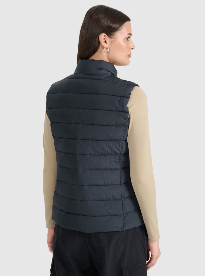 Жіноча пухова безрукавка з коміром-стійкою та легкою конструкцією, що робить її придатною як для щоденного використання, так і для спортивних занять у теплі дні та перехідні періоди .